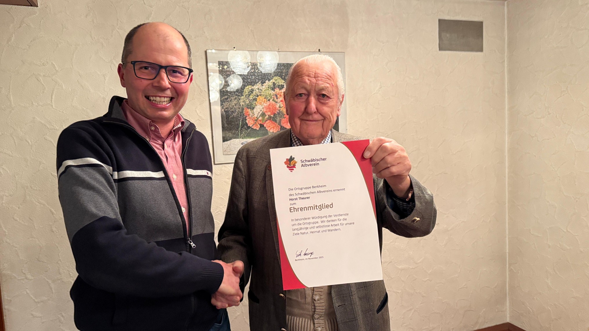 Dafür, dass Horst Theurer mehr als ein Berufsleben lang die Rolle des Wanderwarts in unserer Ortsgruppe inne gehabt hatte wurde ihm die Ehrenmitgliedschaft der Ortsgruppe verliehen. Ununterbrochen seit 1967 – also insgesamt 59 Jahre – war er Wanderwart unserer Ortsgruppe und zuvor 10 Jahre lang Jugendwart. Es gibt wohl kaum einen Weg im Bereich des Albvereins der von ihm nicht irgendwann irgendwie mal begangen wurde. Für sein enormes Engagement hat er schon die großen Auszeichnungen des Albvereins bekommen. 1991 wurde ihm damals bereits für mehr als 20 jährige Tätigkeit die silbernen Ehrennadel verliehen. 13 Jahre später folgte 2004 das Ehrenschild des Albvereins. Damit hatten wir noch einen Pfeil im Köcher bzw. eine besondere Ehrung – die Verleihung der Ehrenmitgliedschaft in unserer Ortsgruppe. Lieber Horst, herzlichen Dank für Dein Wirken und Schaffen in unserer Ortsgruppe.